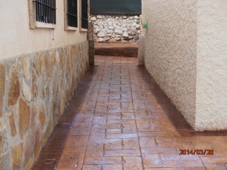 El hormigón impreso en realidad es una solera cuya superficie viene pigmentada y tiene un “bajorrelieve”, grabado mientras está fresco mediante moldes de neopreno que simulan las piezas y texturas más variadas. La estampación puede imitar adoquines, piedra, baldosas, pizarras… Al ser antideslizante, también da excelente resultado en la zona de la piscina. La clave de este pavimento es la capa superficial endurecedora y coloreada, que viene en polvo ya preparada de fábrica.